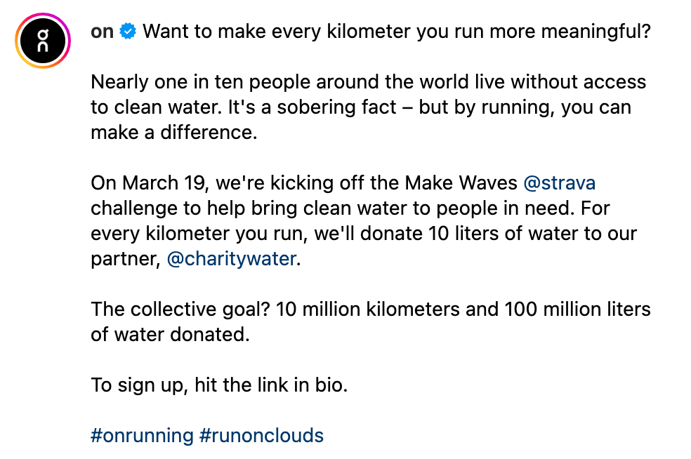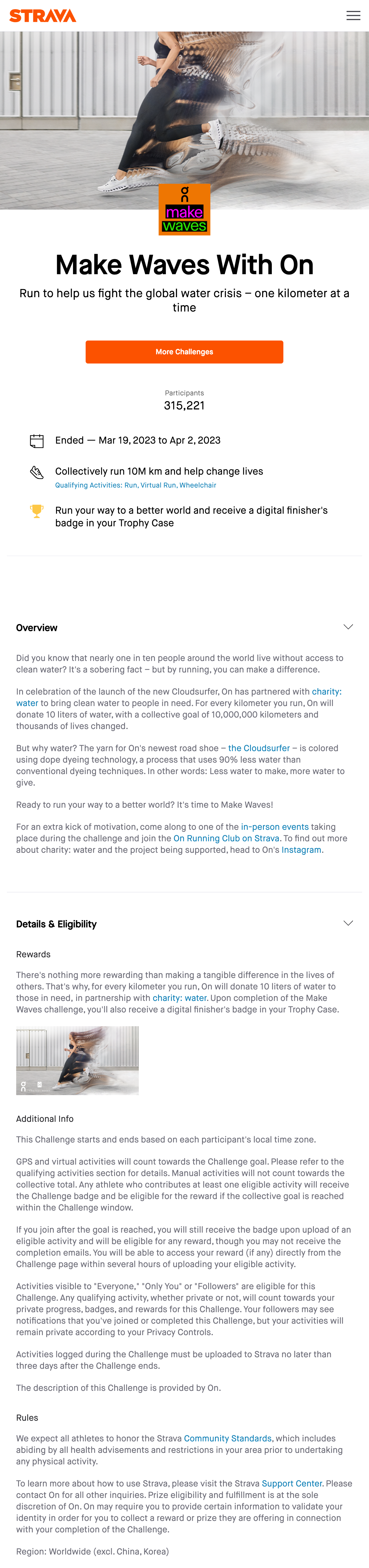 Social and landing page copy for the “Make Waves” Strava challenge, in support of charity:water.